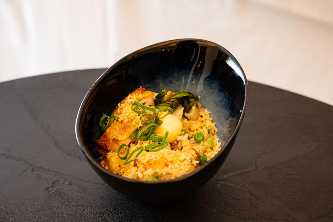 24 Std. mariniertes Five-Spice-Chicken, gegrillter Pak Choi, fried Vollkorn-Reis mit Erbsen, Siracha-Mayo und Wasabi-Panko-Crumble